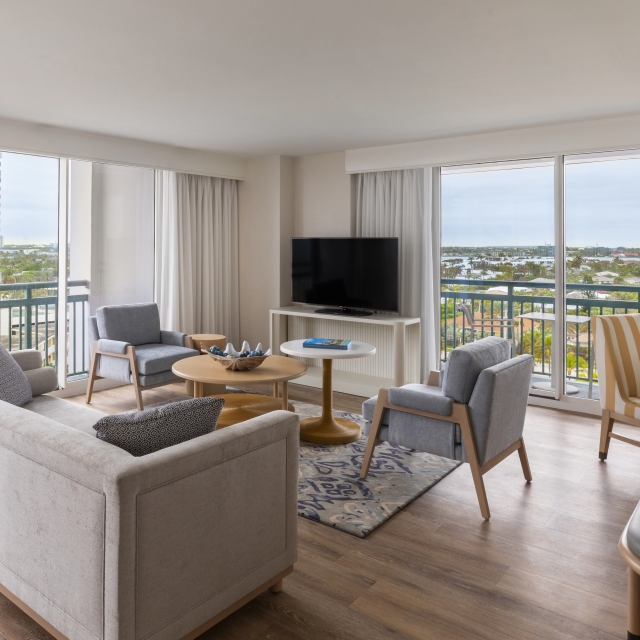 The largest and most luxurious of our accommodations, the Royal Palm Suite blends contemporary coastal style with the comforts of home. Thoughtfully designed in warm, neutral tones, the suite boasts floor-to-ceiling windows and a generously sized private balcony, where you can luxuriate in warm sunshine, gentle sea breezes, and views of the scenic Intracoastal Waterway. Enjoy a spacious bathroom, a walk-in closet, a king-sized Serenity bed, and a pull-out sofa for additional comfort.